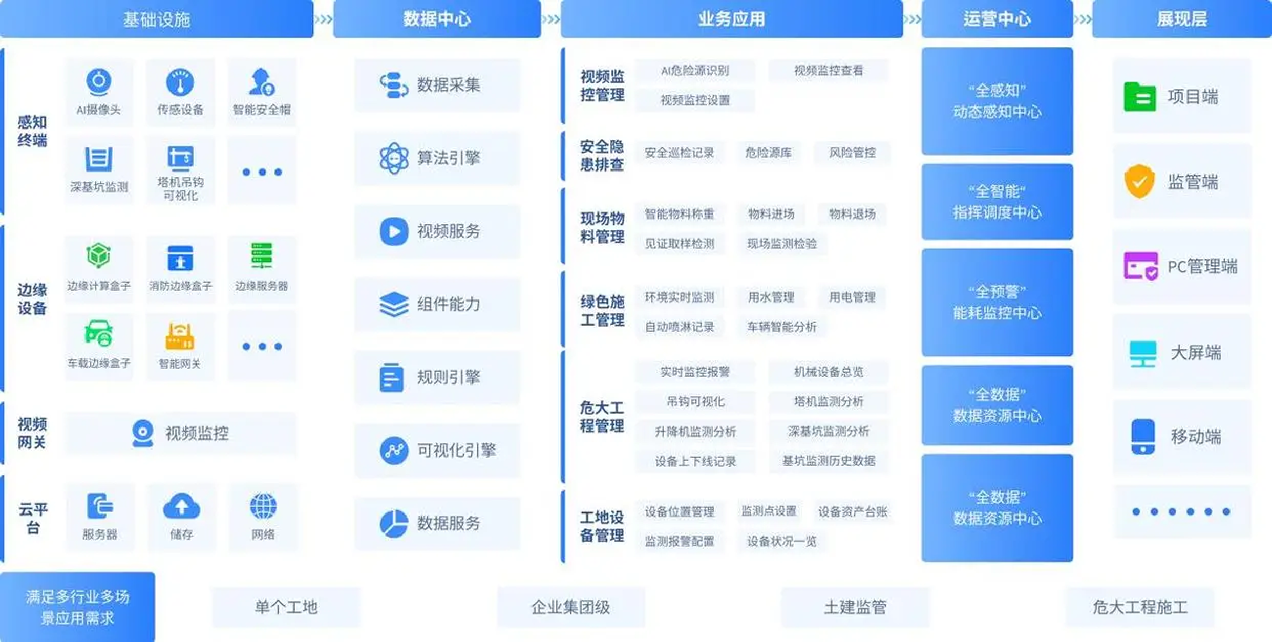 建立人、机、料、法、环多个维度的施工综合管理服务:人员安全管理、工人实名制管理、劳务费用管理、设备安全管理、施工安全管理、物联监测、视觉AI、质量管理、物资管理、进度管理、BI大屏服务等。